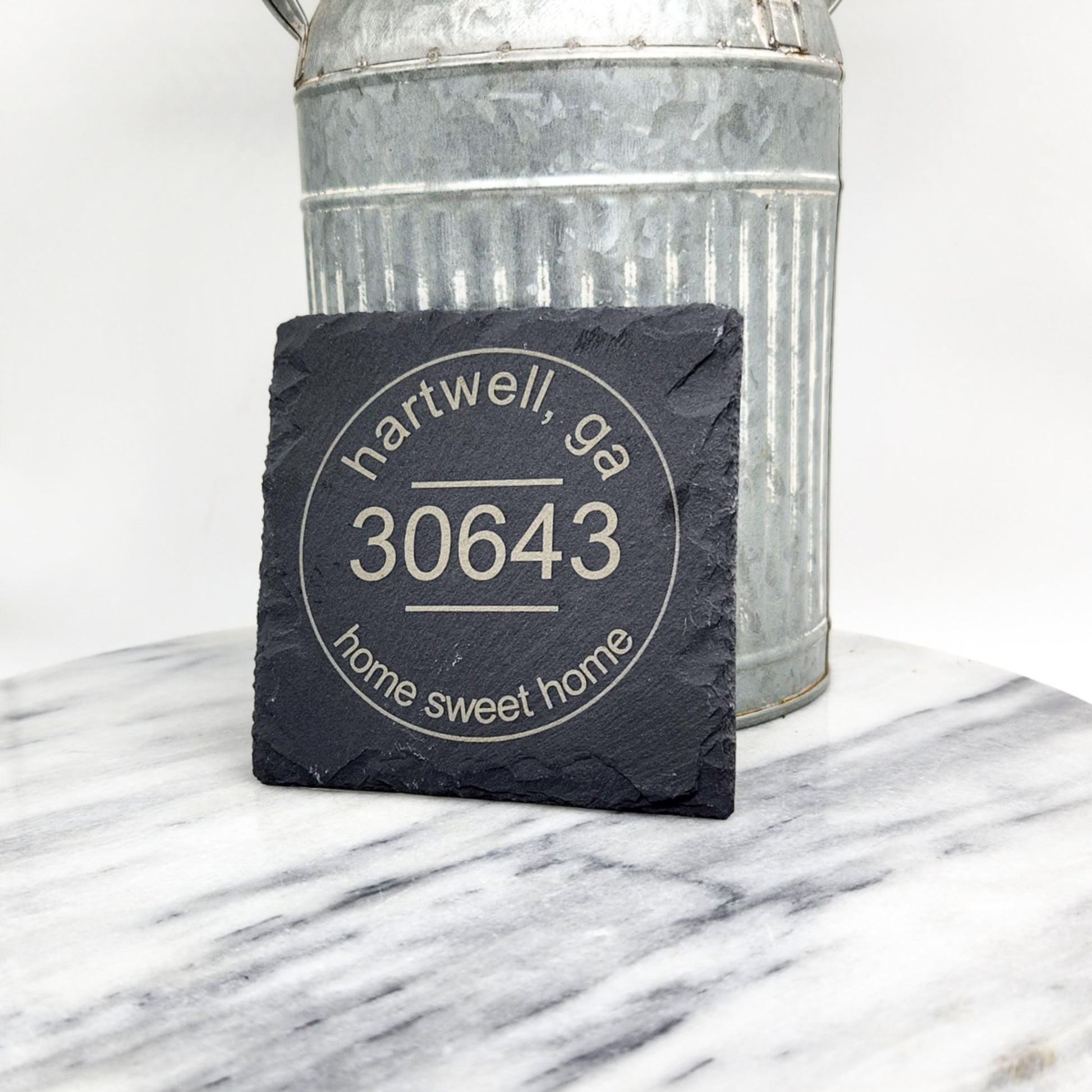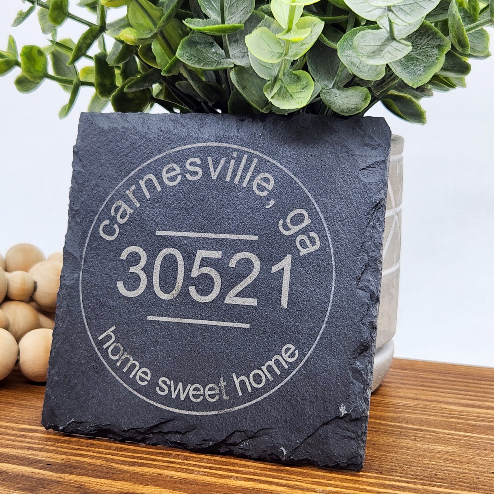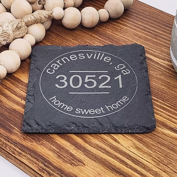 Show off your roots in style with this beautifully crafted 4-inch slate coaster, custom-engraved with your city, state, and zip code. Whether you're celebrating where you were born, where you live now, or a place close to your heart, this coaster brings a personal touch to any coffee table, office desk, or bar setup.